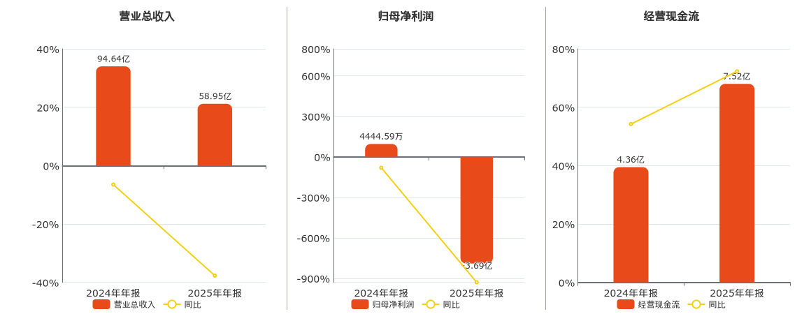 公司交易总收入为58.95亿元,在已露馅的同行公司中排行第4,较旧年同论述期交易总收入减少35.69亿元,同相比旧年同时下落37.71%。归母净利润为-3.69亿元,在已露馅的同行公司中排行第7,较旧年同论述期归母净利润减少4.13亿元,同相比旧年同时下落929.74%。霸术活动现款净流入为7.52亿元。